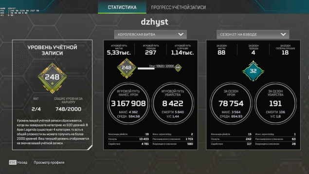 Подробное описание: Продаю свой личный аккаунт Apex Legends. KD 1.44. На аккаунте присутствуют 150 осколков реликвии, куплен боевой пропуск, есть 247 легендарных скинов, 4085 металлов, 50 экзотических шардов, а также даймонды прошлых сезонов. На аккаунте наиграно свыше 1.3к часов. Причина продажи — устал от игры. Ссылка на яндекс диск с кратким обзором аккаунта: disk.yandex.ru/i/3nT-Aj3hzMmHtw (обзор скинов персонажей)