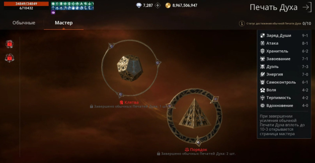 Заряд Души 9-1, Атака 8-1, Хранитель 6-2, Завоевание 7-1, Дуэль 7-3, Энергия 7-0, Самоконтроль 6-1, Воля 4-2, Терпимость 4-2, Вдохновение 4-0.