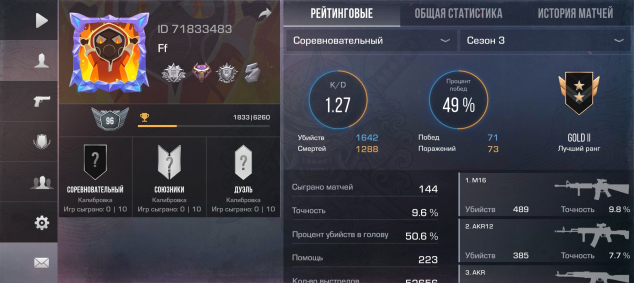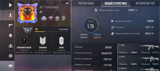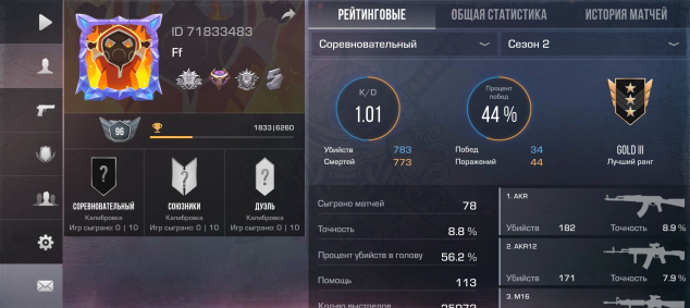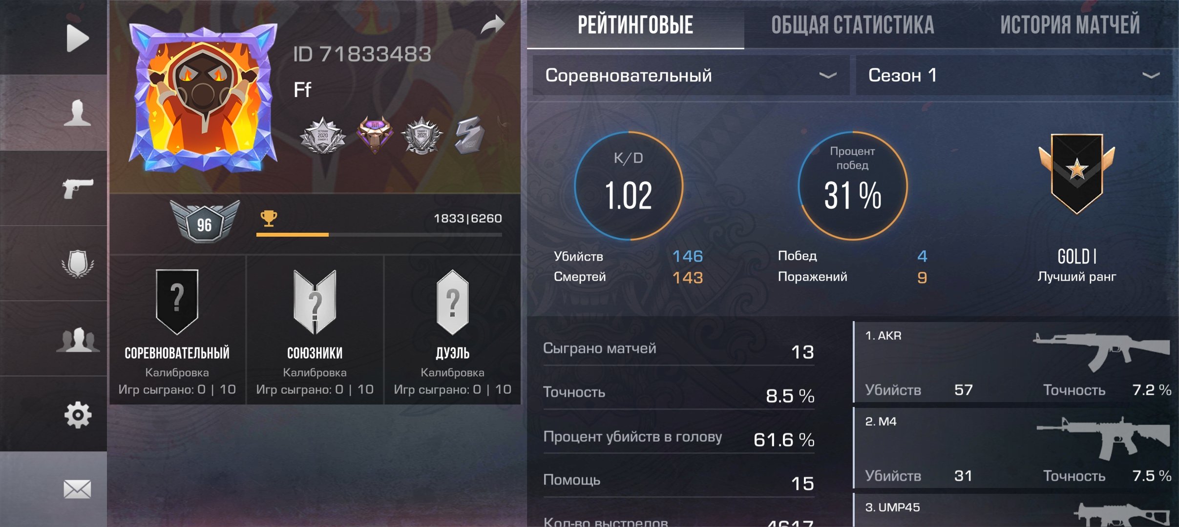 Звание: LegendКраткое описание: ✨1091 ЧАСОВ✨❤️КД 1.75 ( 29К КИЛЛОВ)❤️🔥ИГРАЛ С 1 СЕЗОНА🔥🌈8-МИ ЗНАЧНЫЙ АЙДИ🌈🥇МНОГО ОЛД МЕДАЛЕЙ 🥇