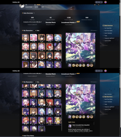 На скамейке запасных (80 лвл, одеты, следы): м.ГГ память, Блейд, Клара Е3 (сигна), Жуань Мэй, Галлахер Е4, Тинъюнь Е6, Рысь Е6. Аста Е6 и Пела Е3 просто подняты до 80.