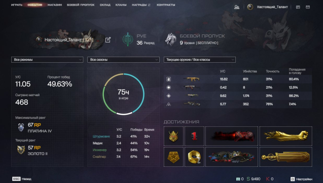 ⭐74.361 корон (36 разряд PVE) | 13.269 деталей | Золото 2 | 9 уровень БП (не куплен) |
