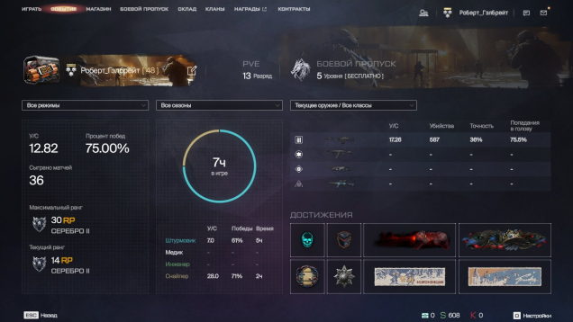 Краткое описание: 💜 48 ранг 💜|Чистый ник|10к деталей|✅Кампания |CKC FAB|Стилет «Вампир»|Топ достижения|Броня «Варяг»|