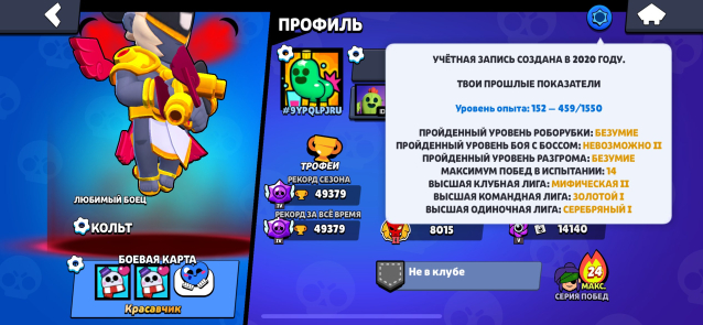 🏆𝟒𝟗𝟑𝟕𝟒 кубков | 👑 Ранг: Серебряный 𝟏 | 🎯 𝟏𝟗𝟔𝟏𝟑+ потраченных гемов на скины