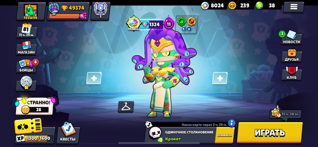• 𝟐𝟑𝟗 монет 💰 / 𝟑𝟖 гемов 💎 / 𝟖𝟎𝟐𝟒 блингов 🎟️ / 𝟒𝟔𝟒𝟏𝟗 очков силы 🌟