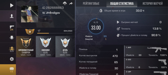 Подробное описание: Очень редкое Айди 262666663 общее кд 33 в напах 4кд в мм 6кд в дуэлях 3-4 кд за такую цену мало