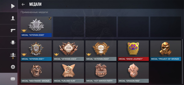 — Имеется медаль ветерана 2020 года качества RARE( С полным списком медалей можете ознакомится ниже.)