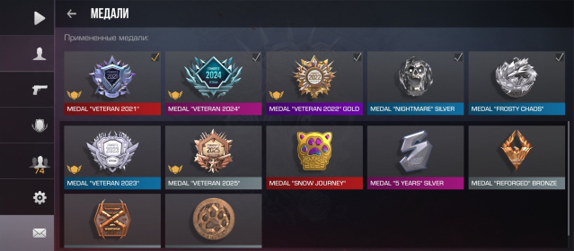 🥇МЕДАЛИ: ДАЙМОНД ВЕТЕРАН 2021 (АРКАНА), ПЛАТИНУМ ВЕТЕРАН 2024 (ЛЕГА), ЗОЛОТОЙ ВЕТЕРАН 2022, И МНОГО ДРУГИХ МЕДАЛЕЙ ЗА БАТЛПАССЫ, ТАК ЖЕ ЕСТЬ ДОНАТНЫЕ СИЛЬВЕР МЕДАЛИ ЗА КУПЛЕННЫЕ БАТЛПАССЫ🥇