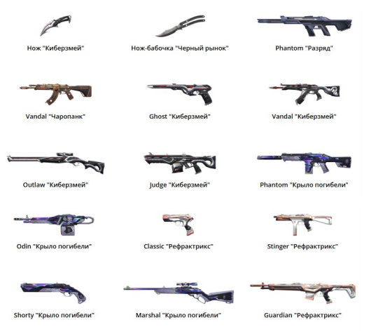 🌟 Нож „Киберзмей“, Нож-бабочка „Черный рынок“, Phantom „Разряд“, Vandal „Чаропанк“, Ghost „Киберзмей“, Vandal „Киберзмей“, Outlaw „Киберзмей“, Judge „Киберзмей“, Phantom „Крыло погибели“, Odin „Крыло погибели“, Classic „Рефрактрикс“, Stinger „Рефрактрикс“, Shorty „Крыло погибели“, Marshal „Крыло погибели“, Guardian „Рефрактрикс“