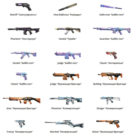 🌟 Sheriff «Сингулярность», Нож-бабочка «Разведка», Лайтстик «Баббл-поп», Phantom «Ноктюрнум», Vandal «Прайм», Guardian «Баббл-поп», Vandal «Баббл-поп», Judge «Баббл-поп», Classic «Интерхельм», Classic «Баббл-поп», Judge «Жужжащая бригада», Bulldog «Жужжащая бригада», Ares «Жужжащая бригада», Phantom «Конвергенция», Stinger «Конвергенция», Frenzy «Конвергенция», Marshal «Конвергенция», Ghost «Жужжащая бригада»