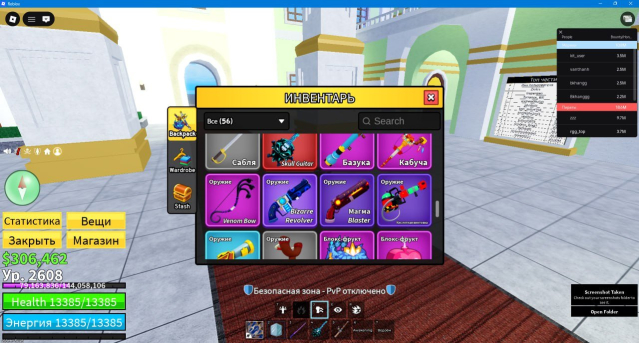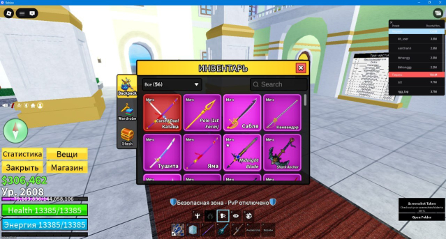 🟢Fisch: lvl. 164 (прокачен слабо, но поиграть можно), деньги 560.000$, в инвентаре есть неплохие секретки (см. фото).