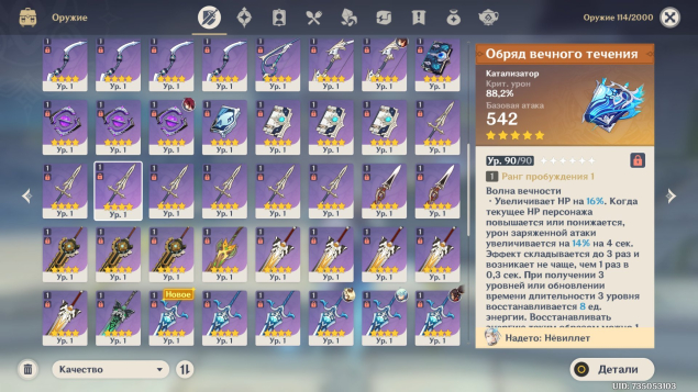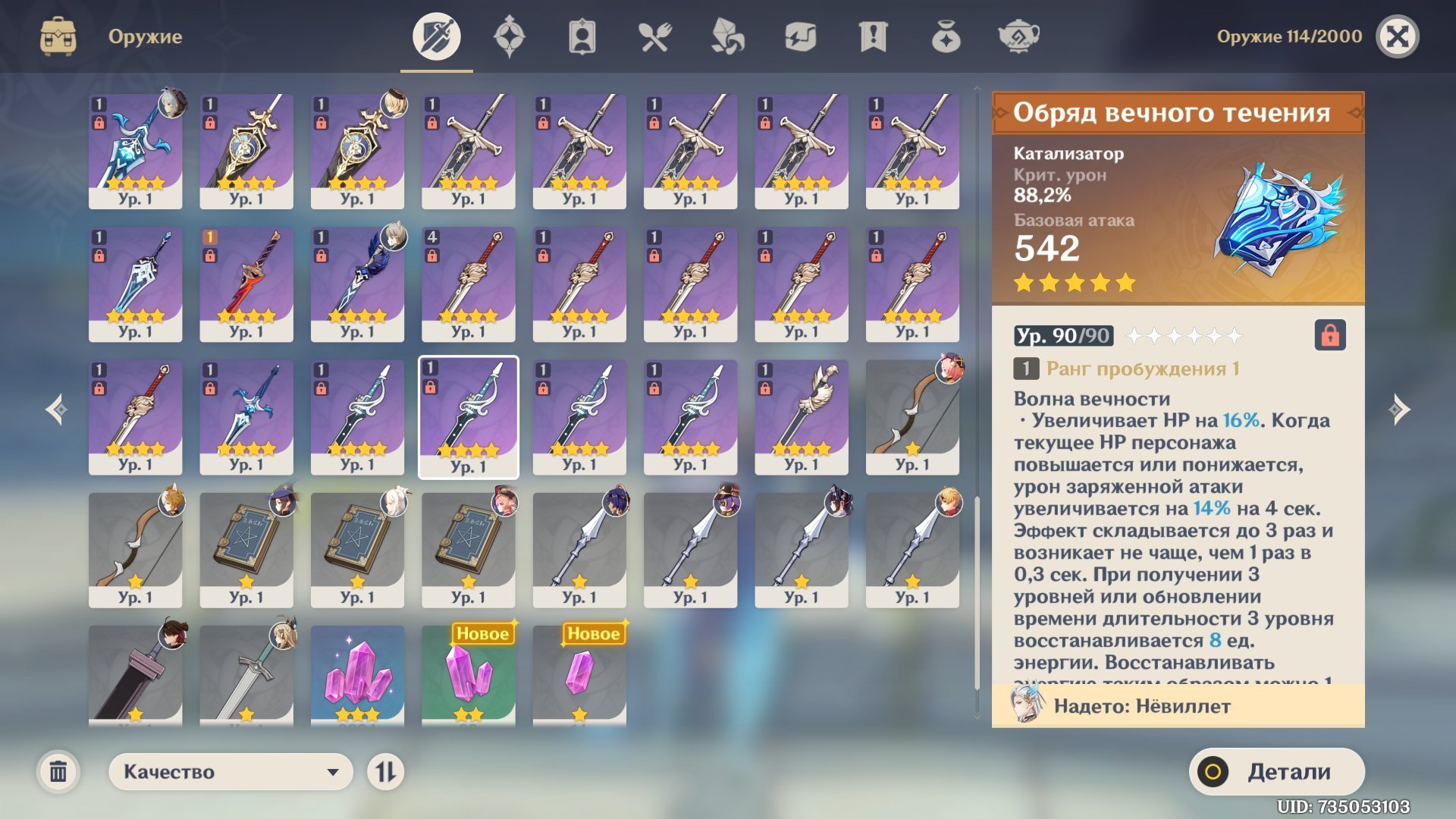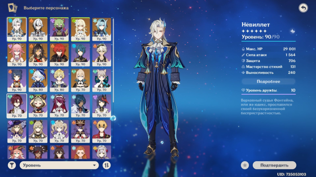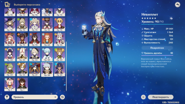 Подробное описание: Играю несколько лет и вот что накопил/задонатил: есть Невиллет(С1+сигна), Арлекино(сигна), Эола, Яэ Мико, Дэхья, Дилюк(сигна), Фурина(сигна), Джинн, Мона(С1), гг(С6) и много эпиков(по типу синцю) с несколькими созвездиями.