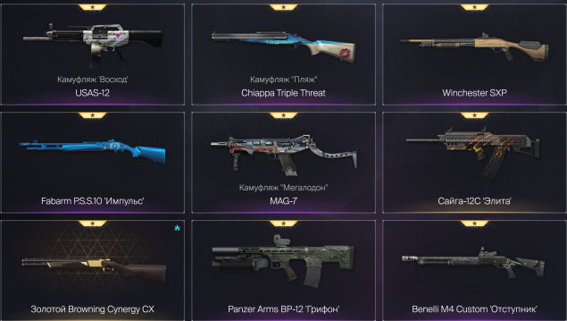 🐻Медик: Winchester SXP +пляж, Chiapa Triple Threat, MAG-7, Сайга-12С «Элита», Золотой Browning Cynergy CX, USAS-12, Panzer ARMS BP-12 «Грифон», Benelli M4 Custom «Отступник», Uzkon UNG-12, Crye Precision SIX12, Mossberg 500 Custom, Fabarm P.S.S.10 «Импульс» и т.д.