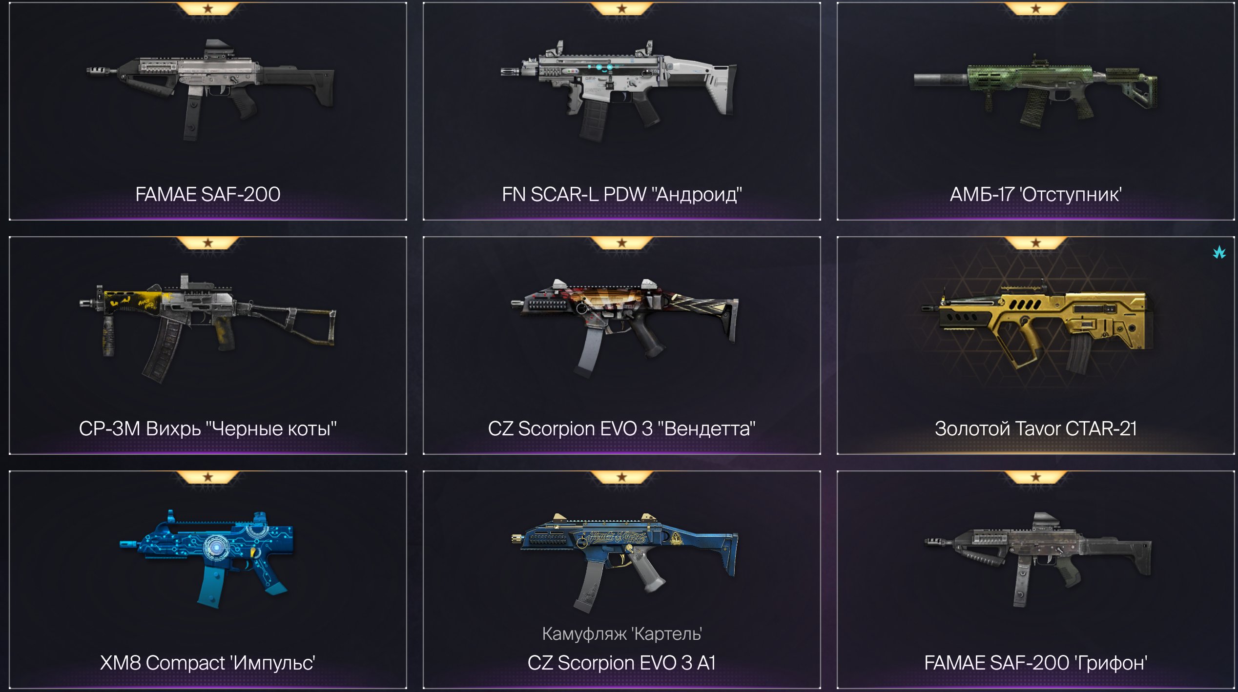 🐻Инженер: FAMAE SAF-200 +грифон, FN SCAR-L PDW «Андроид», АМБ-17 «Отступник», СР-ЗМ Вихрь «Черные коты», CZ Scorpion EVO 3 +вендетта, Золотой Tavor CTAR-21, XM8 Compact «Импульс», CSV-9 «Комодо», Золотой SAR 109T Specs, Honey Badger «Стужа», Desert Tech MDR-C и т.д.