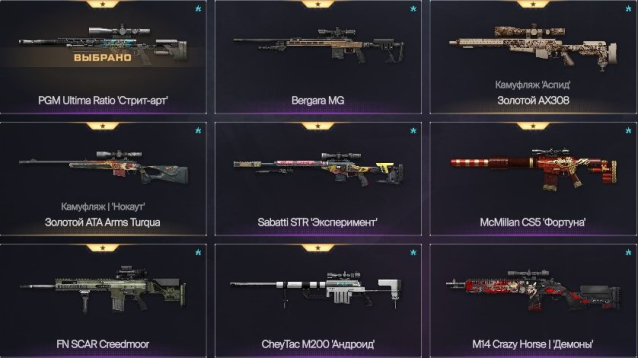 Золотой АХ308 (имеется вариация K.I.W.I), Золотой АТА Arms Turqua,PGM Ultima Ratio«Стрит-арт»,Bergara MG,Sabatti STR «Эксперимент»,McMillan CS5 «Фортуна»,FN SCAR Creedmoor ,CheyTac M200«Андроид»,M14 Crazy Horse«Демоны»,AS50«Механика» (имеется вариация Элита", ОЦ-48К МК2, СВЧ-54, МЦ-572 Астарта
