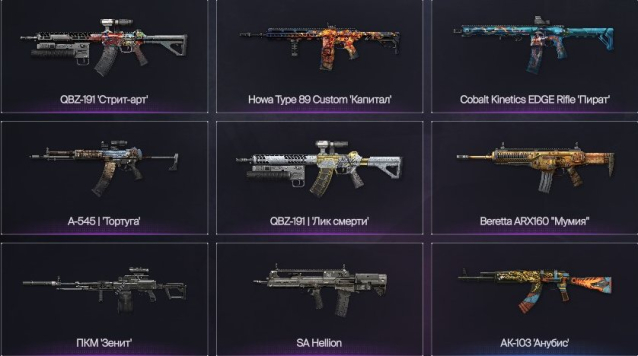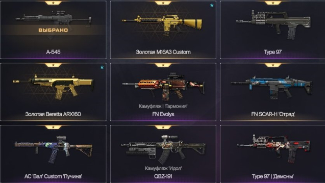 Золотая M16A3 Custom, Золотая Beretta ARX160 ( имеется вариация Мумия) ,A-545 ( имеется еще вариации данного оружия такие как Кайора, Тортуга),Type 97 ( имеется еще вариация Демоны ),FN Evolys,QBZ-191 ( имеется еще вариация Лик смерти, Стрит-арт ),SA Hellion, ПКМ «Зенит»( имеется еще вариация Рагнарок ),FN SCAR-H «Отряд», АС«ВАл» Custom «Пучина»