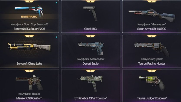 Золотой Chima Lake, Золотой SIG Sauer P226 ( имеется вариация Мятежник),ST Kinetics CPW «Грифон»,Clock 18C ( имеется вариация Пират ),Sulun Arms SR 410700,Desert Eagle ( имеется вариация Панда),Taurus Raging Hunter,Mauser C96,Taurus Judge «Колония»,Colt M1911A1 «Фараон», Пистолет Макарова «Repulse»