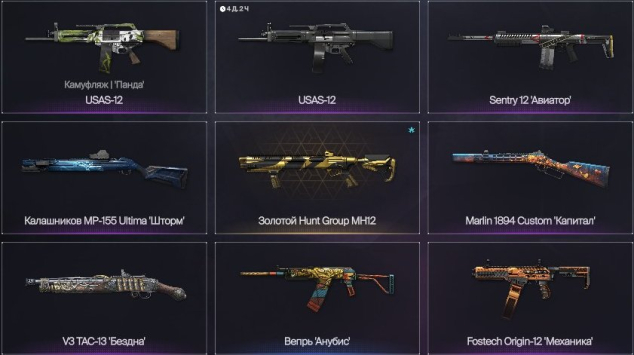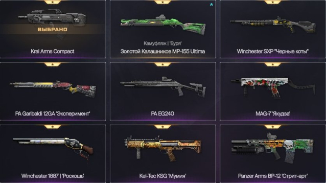 Золотой Калашников МР-155 Ultima (имеется вариация Шторм ),Kral Arms Compact ,Winchester SXP «Черные коты», РА Garilbaldi 12GA «Эксперимент»,PA EG240,MAG-7 «Якудза»,Winchester 1887 «Роскошь»,Kel-Tec KSG «Мумия»,Panzer Arms BP-12 «Стрит-арт»,USAS-12 ,Marlin 1894 Custom «Капитал»,Chiappa Triple Threat,Browning Cynergy CX «Мангуст»