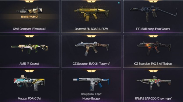 Золотой FN SCAR-L PDW,XM8 Compact «Роскошь», ПП-2011 Кедр-Раra «Секач», АМБ-17 «Схема»,CZ Scorpion EVO 3 «Тортуга» (имеется вариация Пифон),Magpul PDR-C «Ас»,Honey Badger,FAMAE SAF-200 «Стрит-арт»