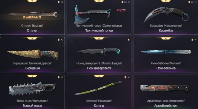 Тактический топор «Демоноборец», Стилет «Вампир, Керамбит „Напряжение“, Киридаши „Великий дракон“, Нож бабочка „Молния“, Боевой тесак „Мегалодон“, Катана „Наследние “ есть БК