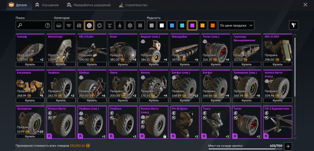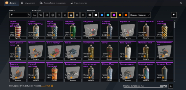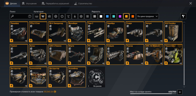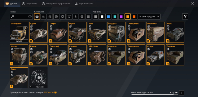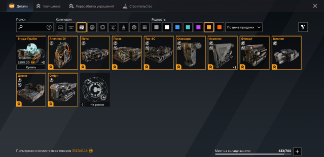 Очень много апов, почти все лег кабины АП, много лег оружия АП, топовые АПы на ходовые ховеры, ноги, винты и модули. Огромное количество красок и наклеек, также ивентовых.