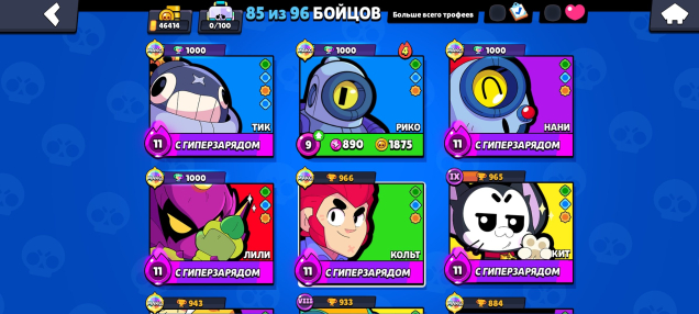 Подробное описание: На аккаунте 85 бравлеров, некоторые из которых максимального ранга, хорошая вкачка, много бойцов на 11 силе и с гиперзарядом. 46.4к кубков, а также легендарная лига в рейтинге. Также если захочется купить скин есть 200 гемов а также золото для вкачки.