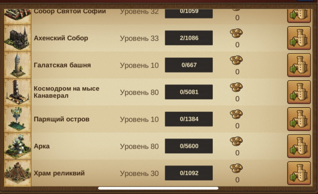 Имеются здания на атаку (зевс, Ахен, кастель) плюс два полных здания из викингов и японцев (поселения, которые дают вкусные здания).