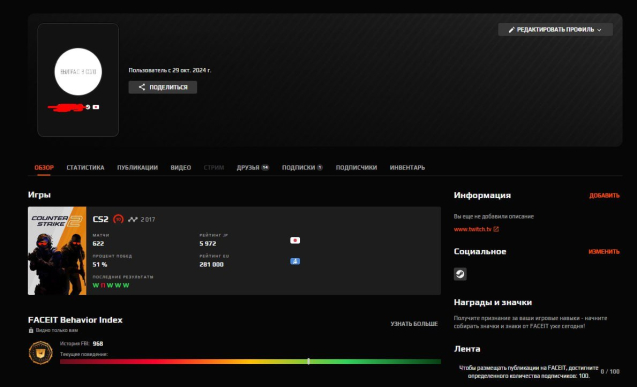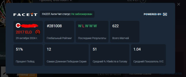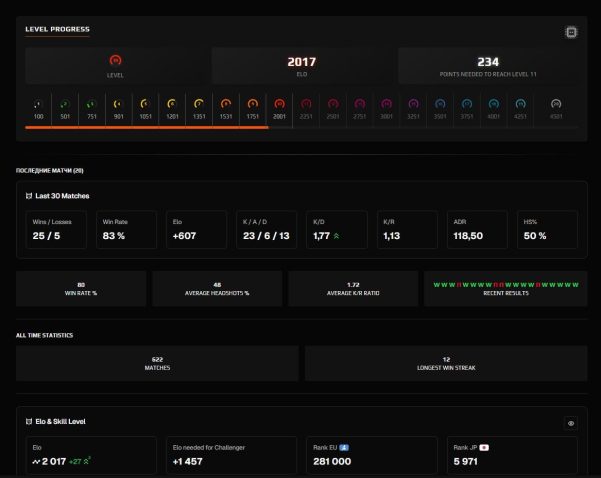 💚 Статистика Faceit: 622 матча, 23AVG, 1.77KD, 118ADR. Аккаунт не смурптульный, 600 матчей за год.