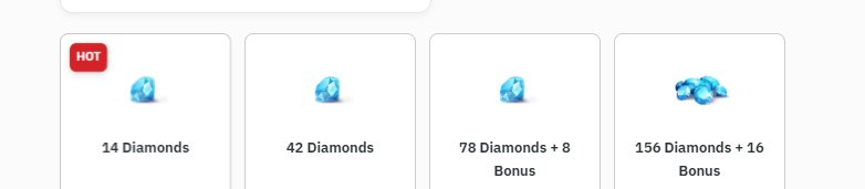 I provide Diamonds top-up only, exactly like the packages shown in the image (14 – 42 – 78 – 156 – etc.).