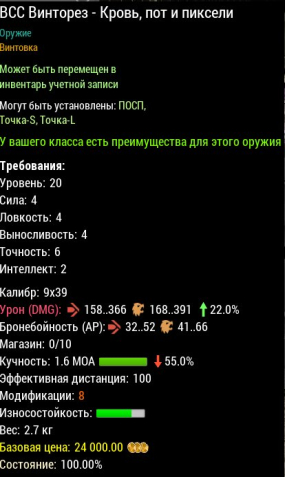 Сервер: RU-3Краткое описание: ВСС Винторез — Кровь, пот и пиксели м8 22% урон -55 кучность 0 износ (все сервера)