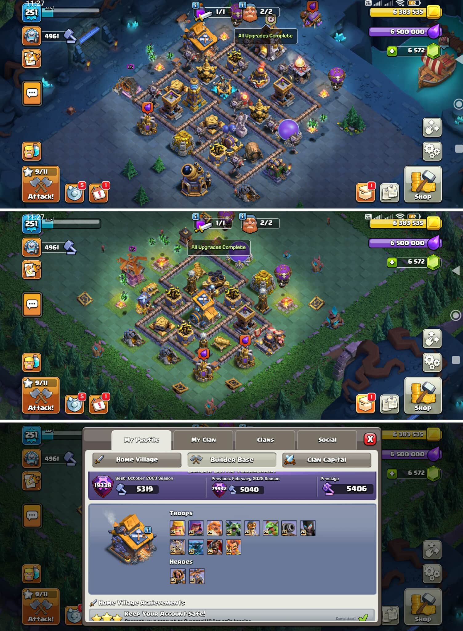 Уровень Ратуши: 17Краткое описание: Xp Level 251~TH 18 Full Max~Heros-103/100/90/75/50~6×Hero Skin~6.5k+ Gems~Connect To Buyer Mail