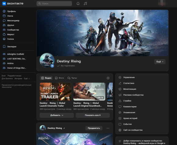 Подробное описание: Сообщество по игре Destiny: Rising. Создано в сентябре 2024 года. Название менялось один раз — было добавлено двоеточие. Являюсь создателем данного сообщества.