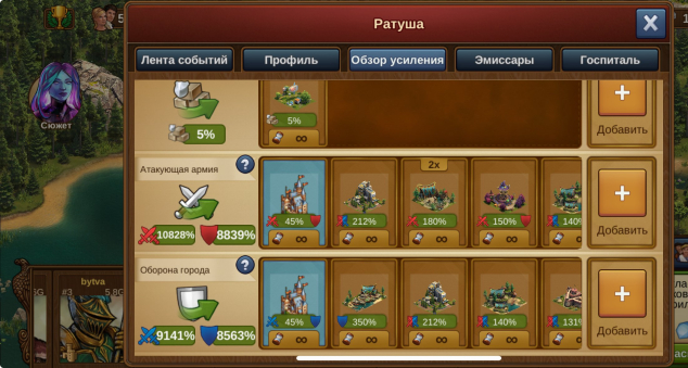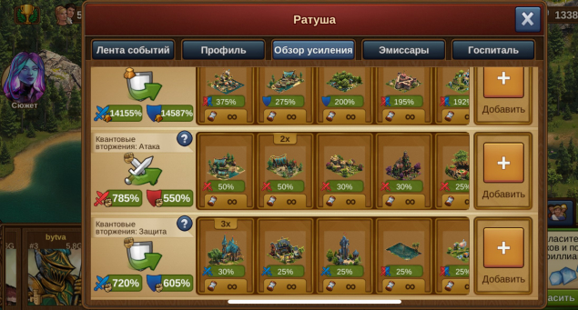 Атака и защита красная и синяя более 8,5к, а на полях и в экспедициях — до 15к (смотреть скрины). Легко проходится 30 уровень сложности экспедиции. Синие и красные бои на полях битвы проходятся на 50 уровне сложности бьются до 60-70 без усилений (при желании и использовании разных усилений/перестройке зданий — до 75+).