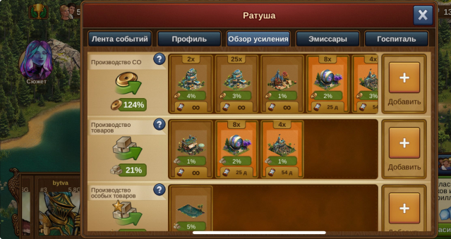Собраны почти все ивентовые постройки, а также полностью все топовые союзники (дают дополнительные характеристики атаки/защиты).