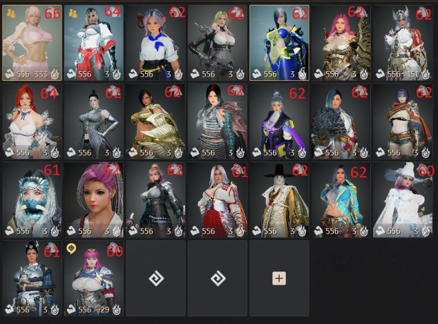 23 перса + 2слота пустых. Твины раскиданы по босикам и т.д. Уровни персонажей в среднем 62 (на скрине красным)