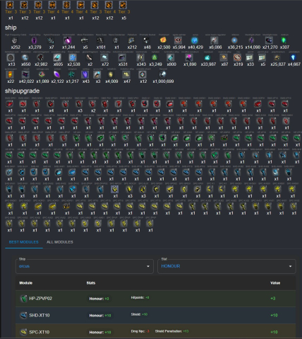 | Orcus (14dmg_laser OR 1speed +10dmg; 24hp +3penetration OR 11hp +2ncp; 10shield +10honour; 13penetration +10honour -3ncp), Centurion (10dmg +1speed; 11hp +2ncp; 14shield +3speed; 14laser hitchance(+2)), Solace (15ncp OR 5dmg; 15hp; 7speed +7laser hitchance) | Have modules for some plus ships