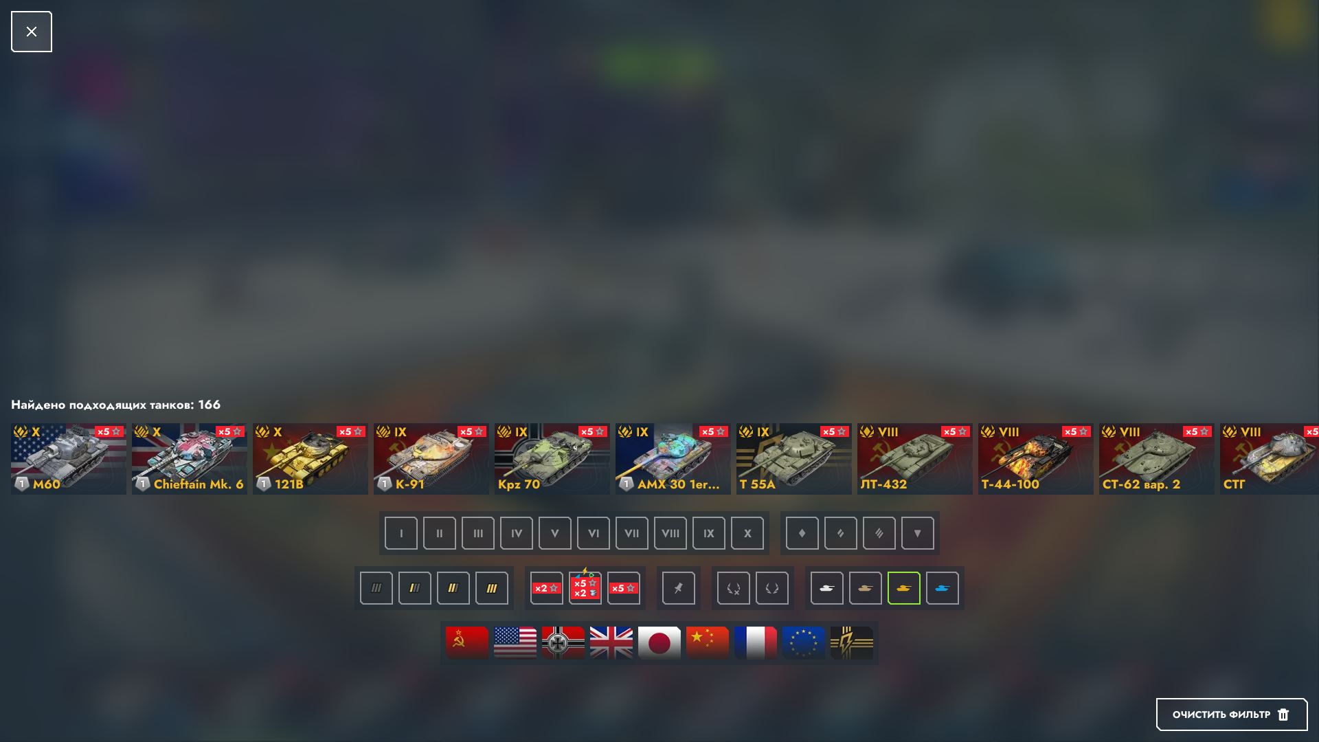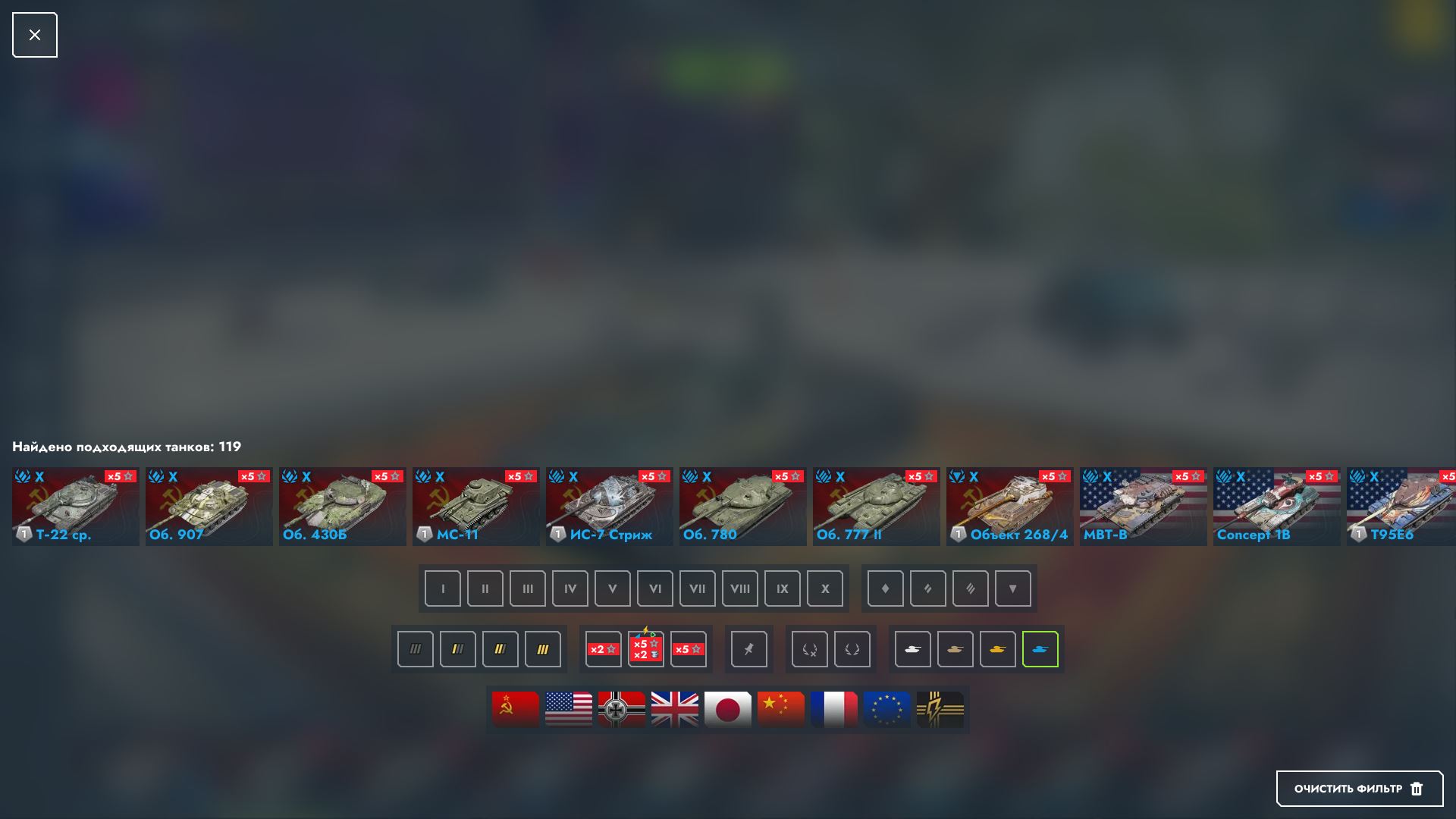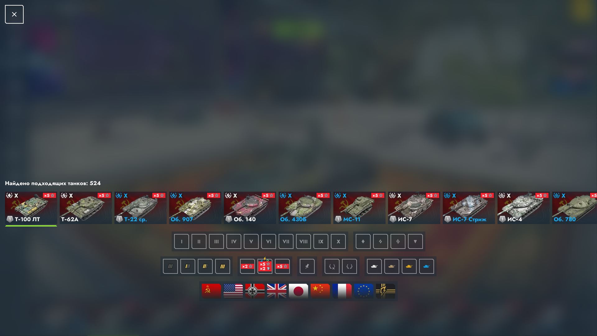 Исследованы все танки, куплены практически все (1, 2, 3, 4, 5, 6, 7 и 10 лвл — все куплены; 8, 9 — куплены не все).