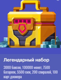 — «Легендарный набор» ( 3000 баксов, 100000 монет, 7500 батареек, 5500 гаек, 200 спиралей, 100 карт джокера )