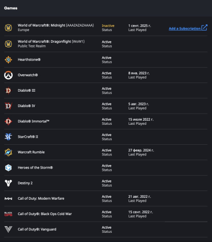 Подробное описание: На аккаунте будет Diablo 4 Ultimate Edition, Overwatch, Destiny 2: Forsaken Complete Collection, StarCraft® II: Wings of Liberty, World of Warcraft: Legion, World of Warcraft®: Battle for Azeroth, Diablo® III Battle Chest, Call of Duty®: Modern Warfare®, Call of Duty®: Black Ops Cold War, Midnight Base Edition.