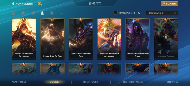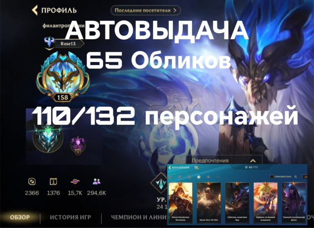 Подробное описание: Продаётся аккаунт 152 уровня с максимальным рангом Мастер.Аккаунт содержит 110 персонажей и 65 обликов, среди которых 5 легендарных: Solar Eclipse Leona, God Fist Lee Sin, Galaxy Slayer Zed, Battle Academia Ezreal, Dark Cosmic Jhin, 33 эпических и 27 обычных скина. Также в наличии 4 завершённых боевых пропуска. Уровень прокачки ролей: Mid 11, Top 9, ADC 4, Jungle 5, Support 5. К аккаунту привязан Gmail, который передаётся новому владельцу