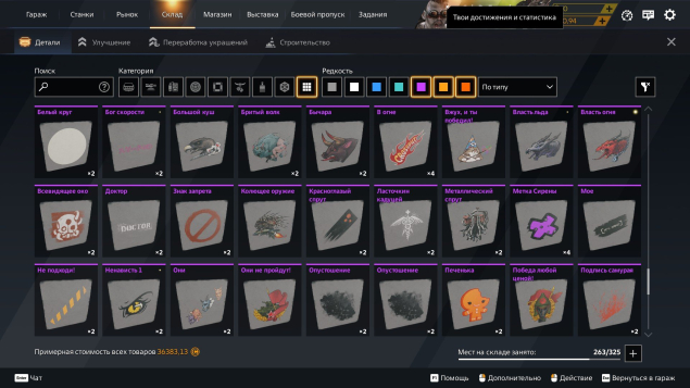 На аккаунте присутствуют несколько недоступных сейчас для покупки деталей, ровно как и уникальный или просто дорогой декор, конструкционные детали из наборов, красители или строительные элементы «Для полигона».