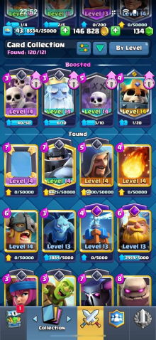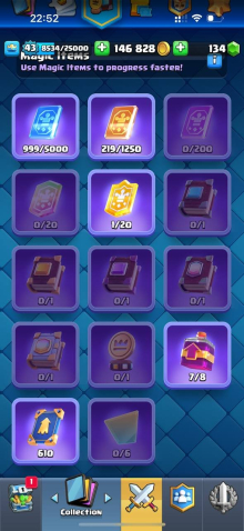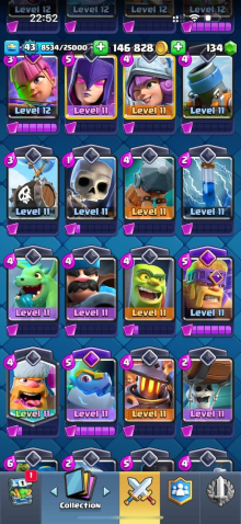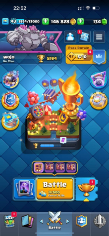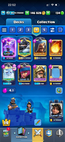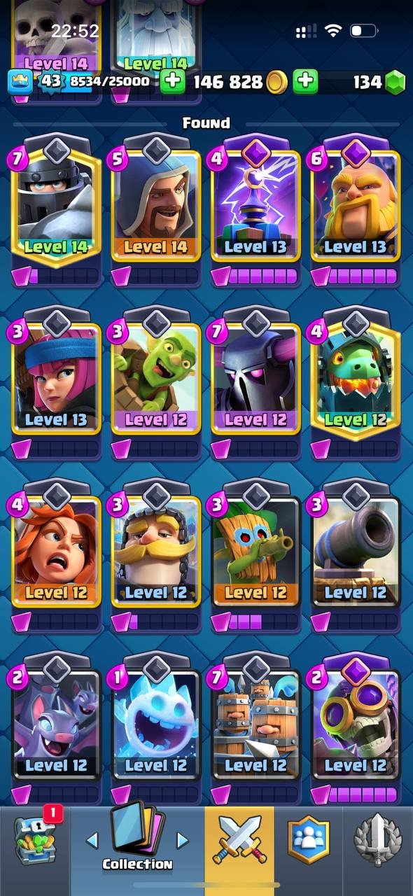 Краткое описание: 8.1 к 🏆, 43 лвл, 6 карт 14 лвл, колода с мегарыцарем, 6 эволюций, 48 эмодзи, описание👇