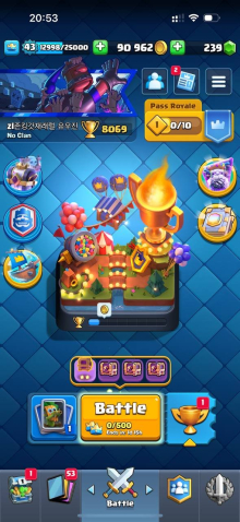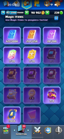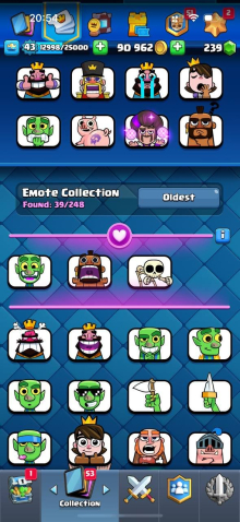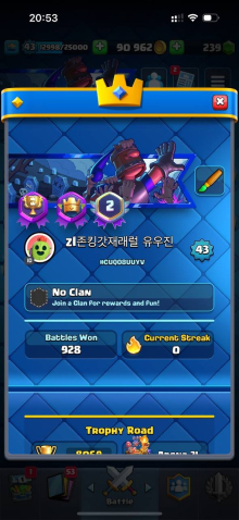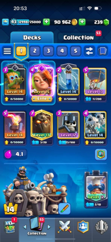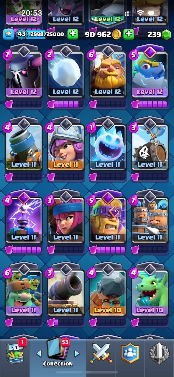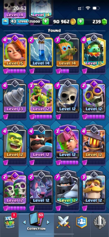 Краткое описание: 8 к 🏆, 43 лвл, 1 карта 15 лвл + 5 14 лвл, колода с гончей, 9 эволюций, 39 эмодзи, описание👇