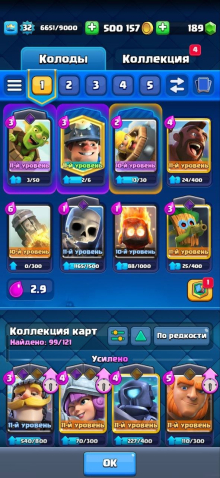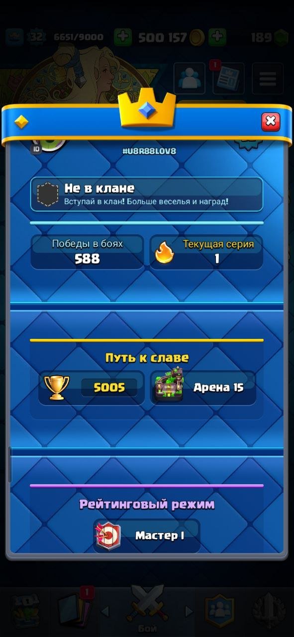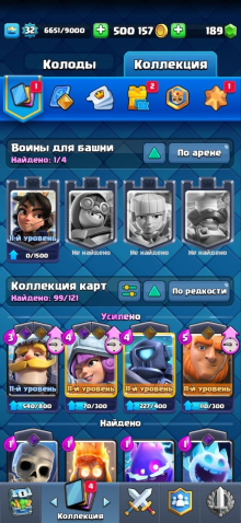 🔮На аккаунте 6100 кубков, 500 000 золота, 188 гемов, 32Уровень, 11ур башни, 20 эмодзи. 99 карт из 121🔮