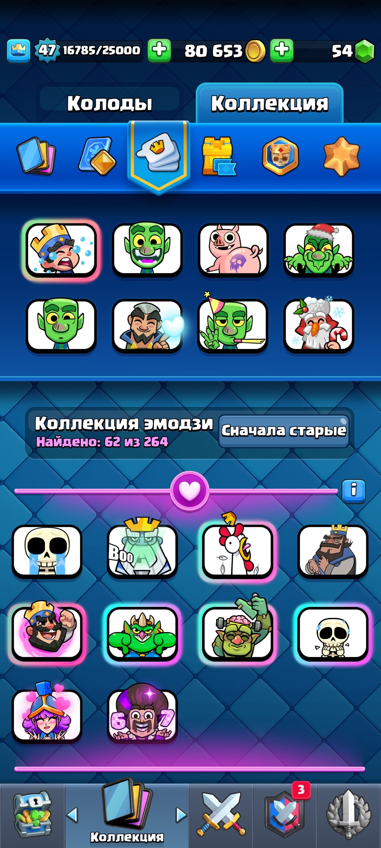 В Клеш Рояле 9500 кубков/все бойцы открыты/63 эмоции, 6 скинов на тавер, 11 полных Эво и 5/6 осколков на ведьму