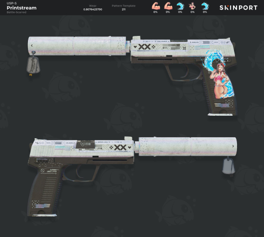 Пистолет USP, любимец игроков в Counter-Strike: Source, имеет отсоединяемый глушитель, который уменьшает отдачу, одновременно поглощая привлекающий внимание шум. Строгий чёрно-белый рисунок украшен перламутровыми элементами.