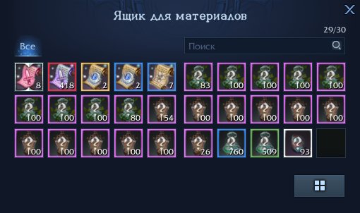 Ресурсы: Куча материалов для синтеза. Есть сундуки с пылью судьбы, а также другие валюты: ремесленная репутация, очки чести, знаки культиста, золотые соверены. Кубы оружейника и бронника + сферы, печати эфе, ирамийские гадальные руны.