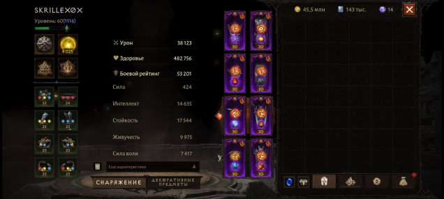 Подробное описание: Вкачаны: Варвар, Буря, Крестоносец, Чародей, Монах, Охотник на демонов, Рыцарь крови, но не выбиты последние сущности.