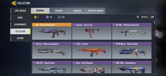 ◘ 🎯 Скины (на оружие): 1 легендарных, 35 эпических, 181 редких