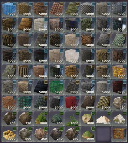 Синий светящийся блок, Бронзовый блок, Грубый блок песчаника, Железный блок, Блок обработанного камня, Металлический блок, Бамбуковый блок, Блок из отшлифованного камня, Блок бревенчатого кирпича, Звездный блок, Храмовый блок Дракков, Гранитный блок, Обсидиановый блок, Фахверковый блок из ракушечника, Блок обработанной древесины, Грубый кремниевый блок, Блок из обработанного песчаника, Медный блок, Блок из просмоленной древесины, Грубый деревянный блок, Блок из Залов умертвий, Обычный песчаниковый блок, Белый светящийся блок, Блок мертвого дерева, Блок из ракушечника, Блок из хвойного дерева, Плетеный блок, Блок из пальмового дерева, Блок «Полуночная гробница», Пустынный храмовый блок, Стена пустынного города, Желтый светящийся блок, Обычный каменный блок, Блок из смешанного песчаника, Зеленый светящийся блок, Замковый блок, Изящный каменный блок, Красный мраморный блок, Блок из обожженных кирпичей, Блок из эктоплазмы, Шлифованный гранитный блок, Блок красного ковра