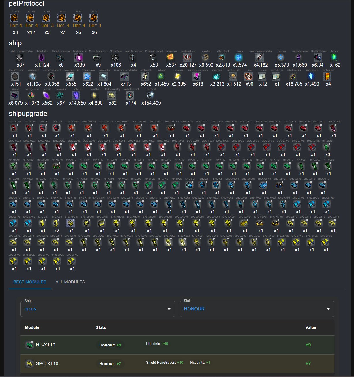 | Orcus (11laser dmg (+1); 19hp +9honour OR 22hp +3ncp +3penetration; 10 shield +3dmg; 11penetration OR 12 laser hitch OR 7honour),